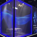 Il concept si ispira all’idea di una “tecnologia che prende forma”, trasformando luce, grafica digitale e materiali traslucidi in un ambiente che comunica immediatamente innovazione e precisione. Le superfici scure e pulite, ritagliate da fasce luminose blu elettrico, creano un perimetro che sembra quasi sospeso, un luogo in cui il visitatore entra in una dimensione futuristica.