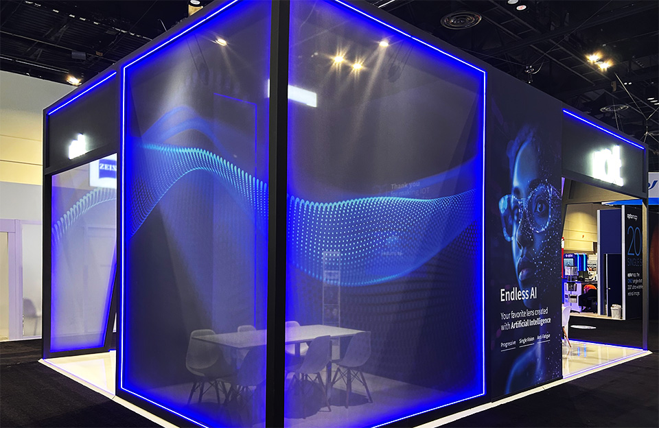 L’immagine di un volto digitale, le onde grafiche che scorrono lungo le pareti e la parola chiave “Endless AI” raccontano una visione chiara: l’intelligenza artificiale come motore creativo, capace di generare nuove geometrie ottiche e nuove possibilità per il benessere visivo. Tutto nello stand è pensato per evocare un viaggio nella tecnologia più avanzata, senza mai rinunciare a un’estetica elegante, ordinata e fortemente identitaria.